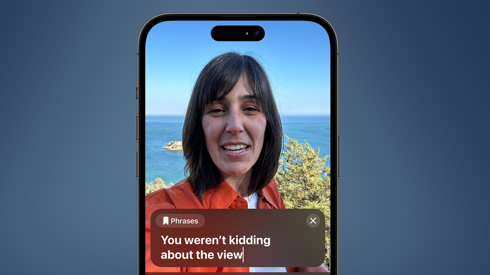 An iPhone on a blue background showing a woman using the Live Speech feature