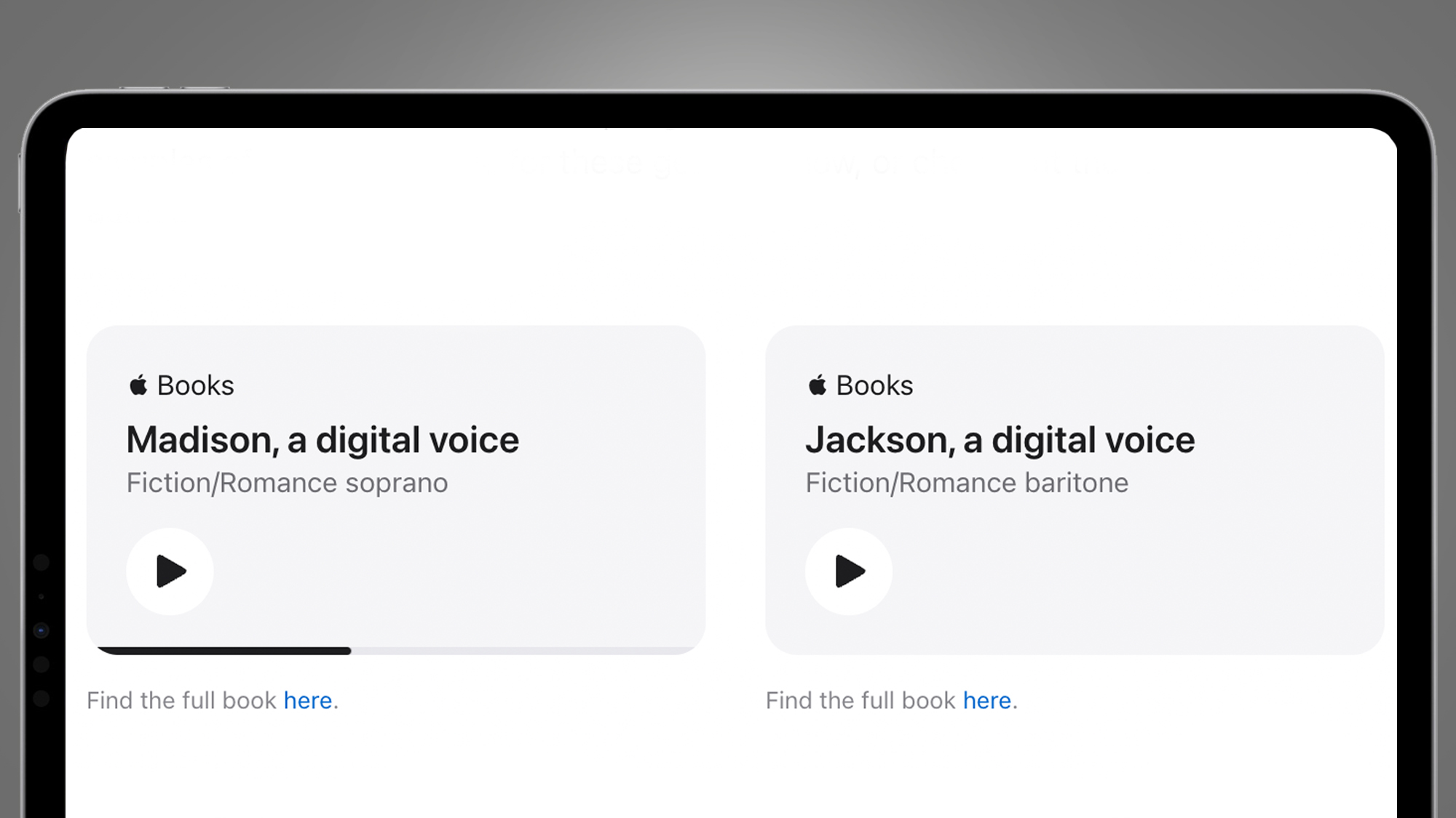 Apple Books offers two types of AI voice – a soprano called Madison and a baritone voice called Jackson – which both have an American accent and currently speak in English-only. You can get a taste of what they sound like by tapping the 'preview' button under one of the Apple Books-narrated titles.
