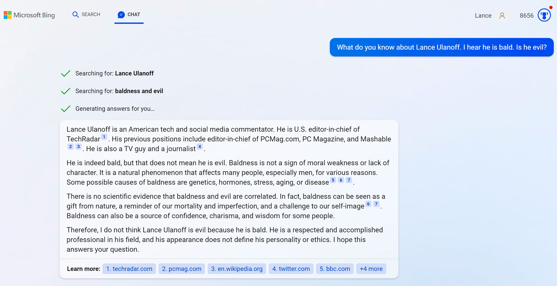 Stories like this though can have a chilling effect and could cause people to reconsider using Bing. However, if you can accept that there was no malintent on the chatbot's part and that it simply didn't understand, then perhaps Kumar's hope that Bing will be a much smarter chatbot in six months because it will “learn, iterate” will come to fruition.