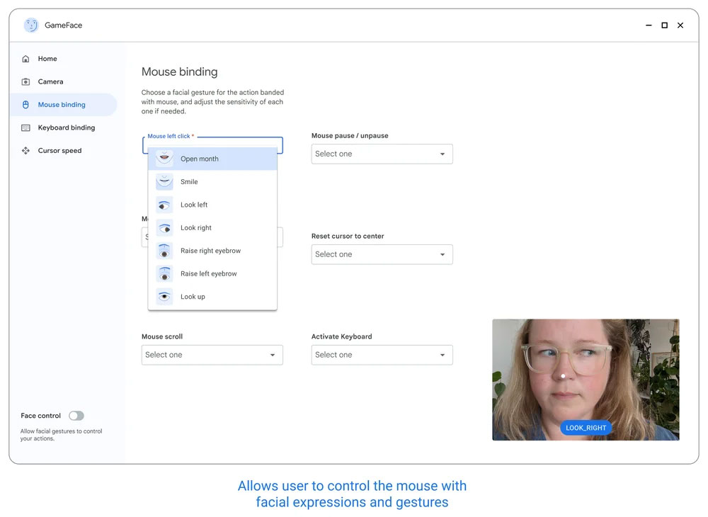 According to Moroney, Project GameFace uses an off-the-shelf webcam and Google's MediaPipe, a system that ties together multiple AI ML models (he didn't specify which ones) to build a live mesh of 468 points on any face. Those points are converted into telemetry for mouse clicks and movement. MediaPipe has also previously been used to create virtual avatars.