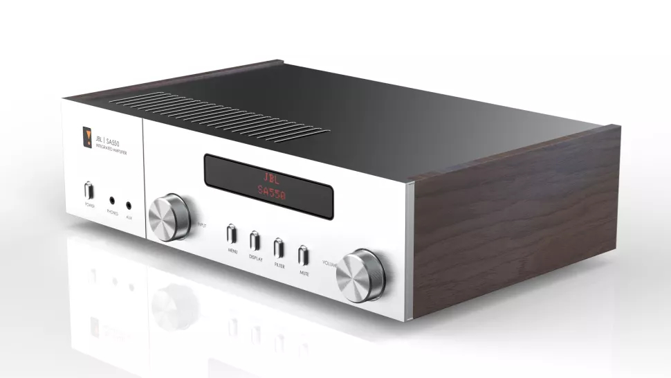 With walnut veneers and brushed metal finishes, the range maintains the nostalgia-tinged design of JBL’s limited edition SA750 integrated amplifier from a couple of years back which was released to mark the brand’s 75th anniversary alongside its well-received L100 Classic speakers.