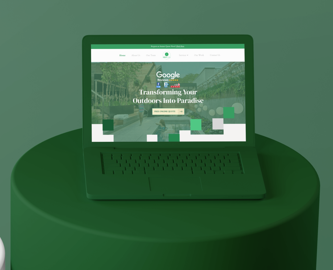 The layout spotlights landscaping and hardscaping with clear CTAs from landing to contact.