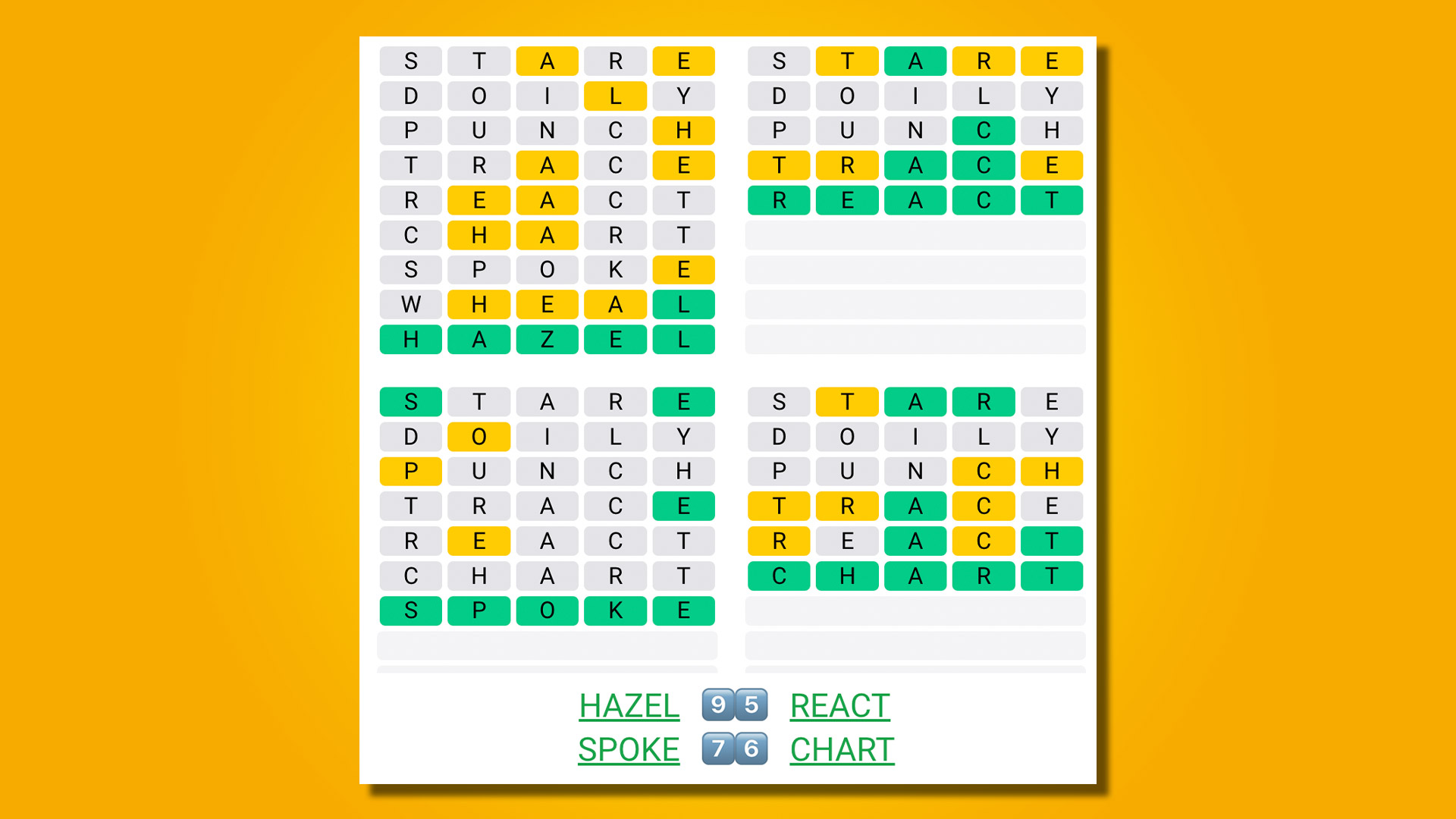 In Wordle, you can instead try several of those in succession and hope one is right, assuming you have enough guesses left. It’s risky, but will sometimes work. Plus, it’s the only option in Hard mode. But in Quordle, this will almost certainly result in a failure – you simply don’t have enough guesses.