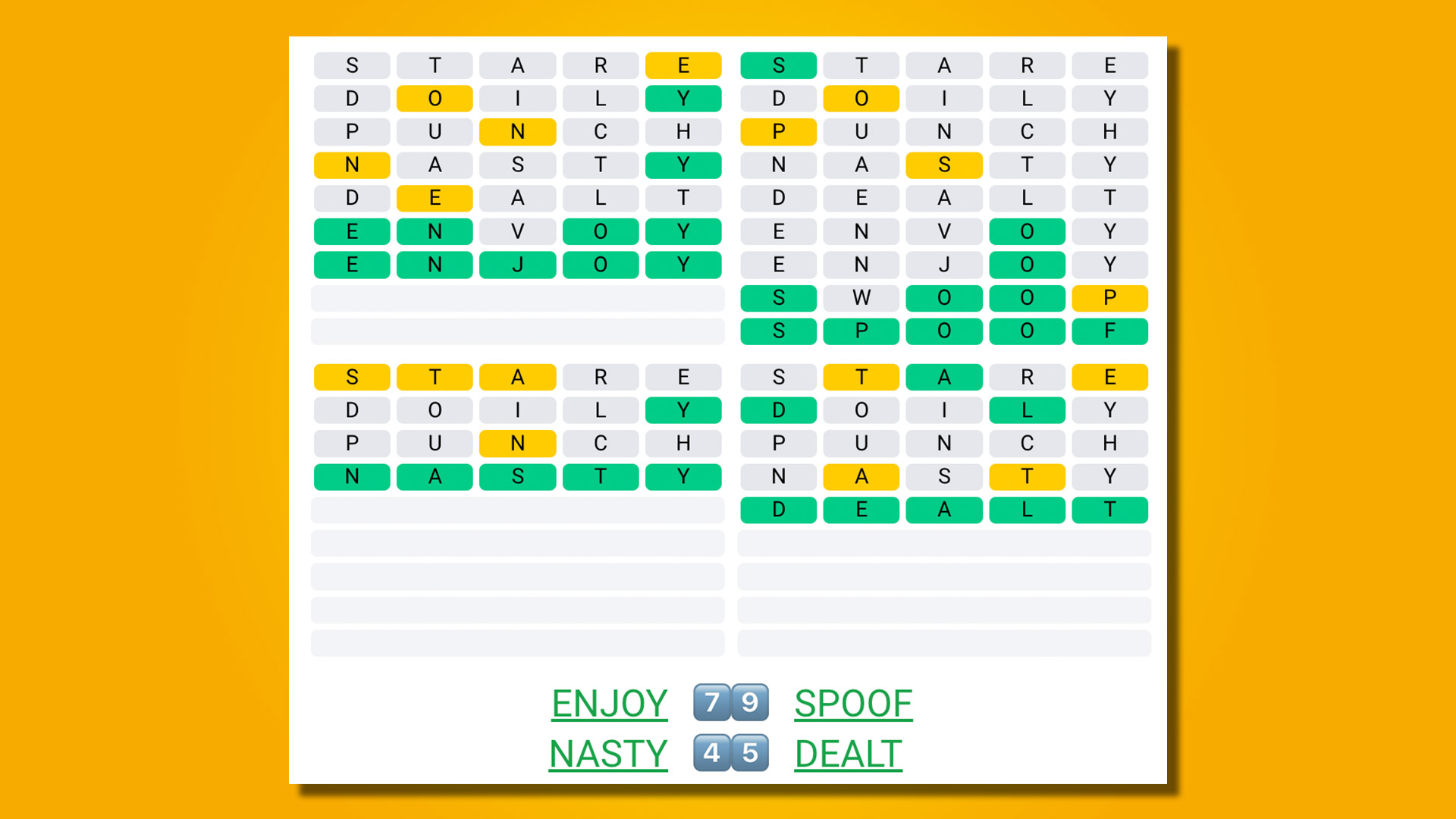The others were harder. Much harder. I had four letters for ENJOY, but guessed ENVOY first – so lost a guess there. And I then repeated the trick with SPOOF, guessing SWOOP first time round. All of which meant that I only solved today's Quordle on the final guess.Â