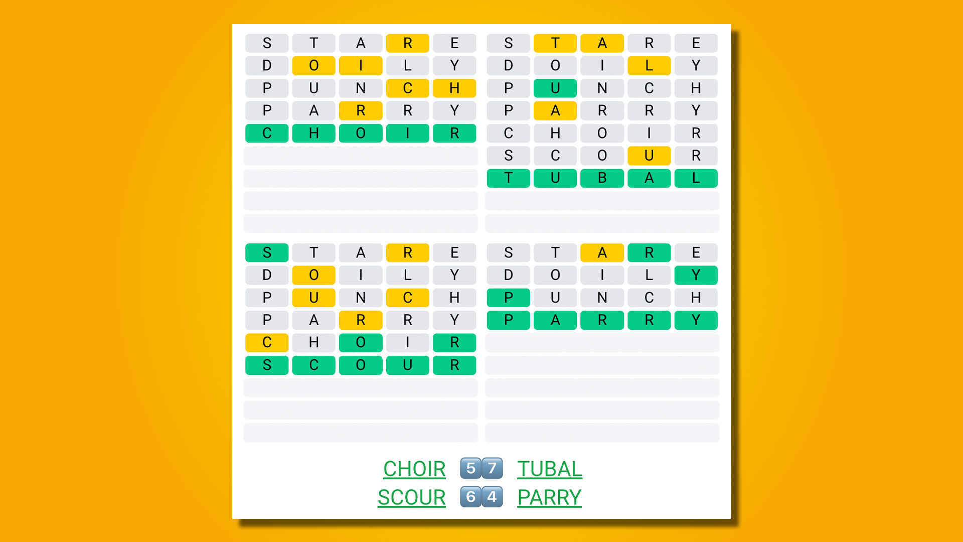 That aside, they aren't too bad. PARRY has a repeated R, but CHOIR and SCOUR are both pretty straightforward and there are no uncommon letters to worry about today.