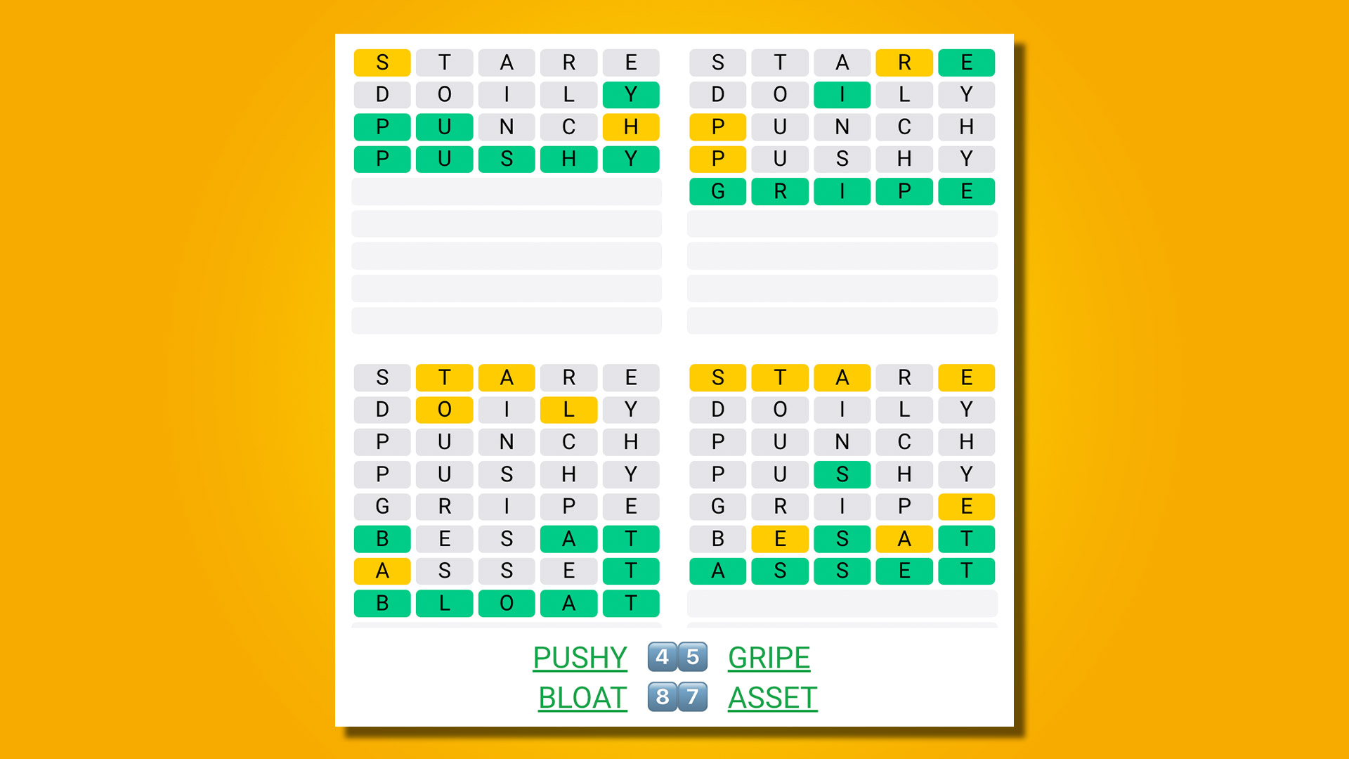 Today, it worked brilliantly: I had all five letters for PUSHY by the end of the third guess, with three already in green. Solving that one was a cinch. What's more, I had four for GRIPE (also easy), four for ASSET (should have been easy but I made one silly guess first) and four for BLOAT (very simple by that stage).