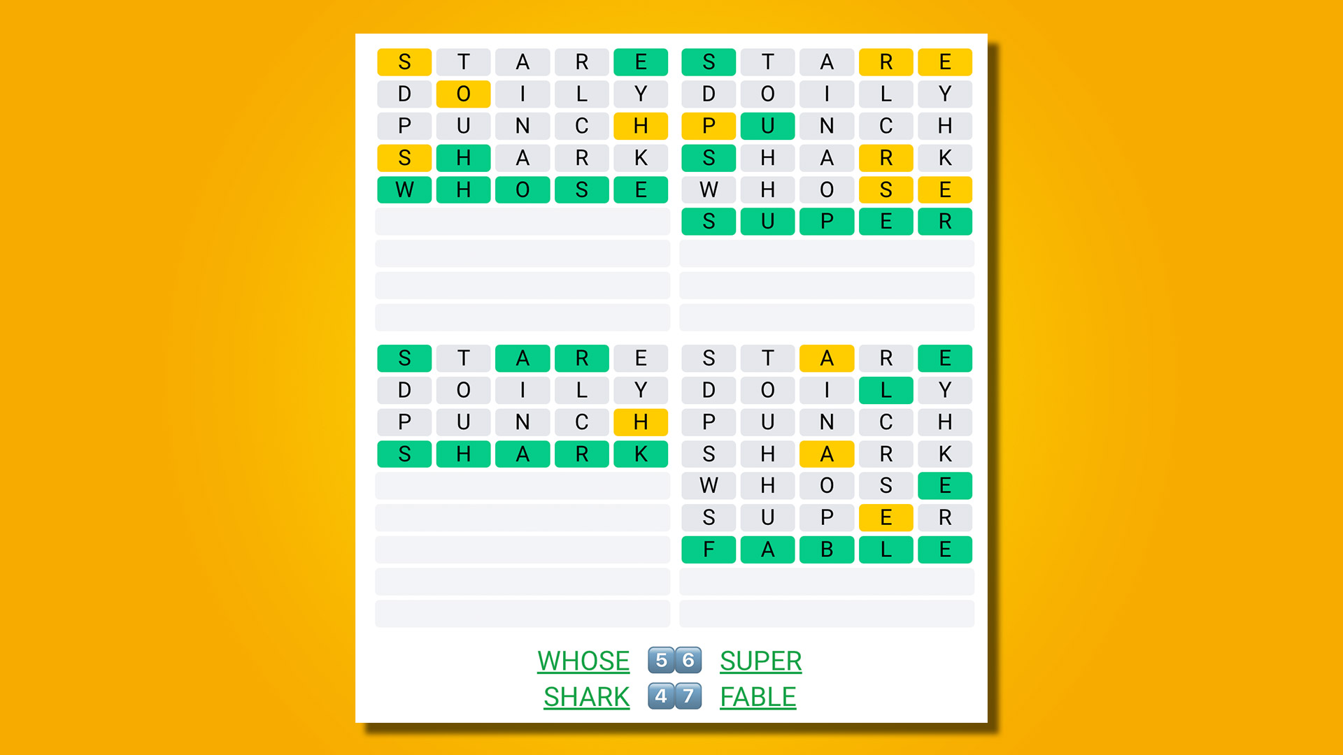 Today's Quordle is one of the easier ones we've had recently. Or at least that was how it played out for me – your game may have gone differently, depending on your strategy. Mine involves beginning with three words – STARE, DOILY and PUNCH – and today these words gave me a very good start. SHARK, for instance, was a very simple solve, because I effectively already had SHAR-, and had already ruled out the likes of SHARP and SHARE.