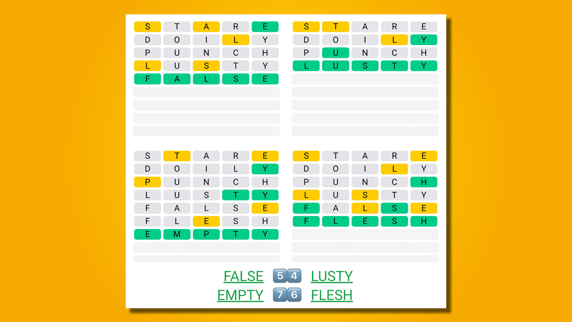 Things were made a lot easier by the fact that none of the four solutions contained any repeated letters, but all four of the words had lots of letters in common. For instance, F started two answers, Y ended two, three contained an L, three an E and three an S. Once you had those five letters you were a long way towards solving the Quordle.