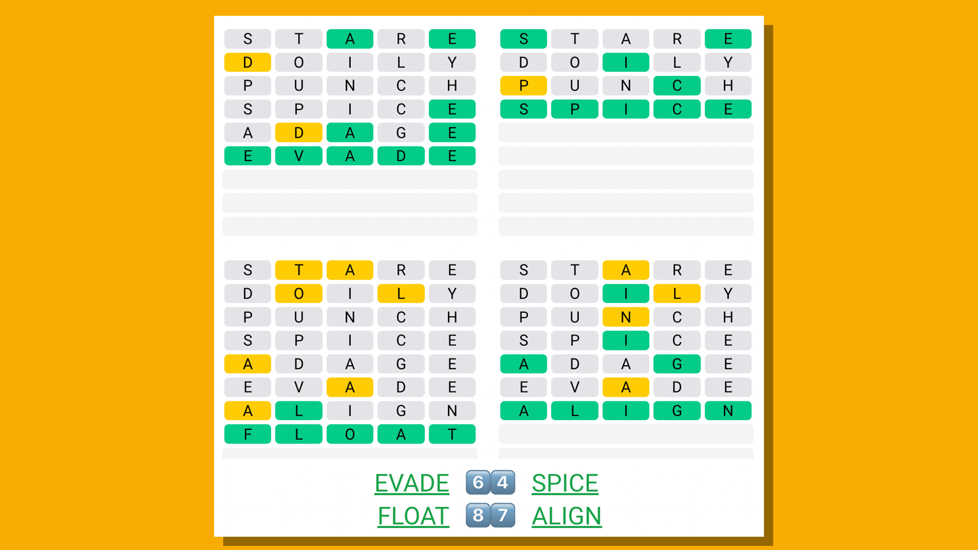 4. …BUT the word you guess appears in all quadrants of the puzzle at the same time, so an A could turn green in one square, yellow in another and gray in the final two.