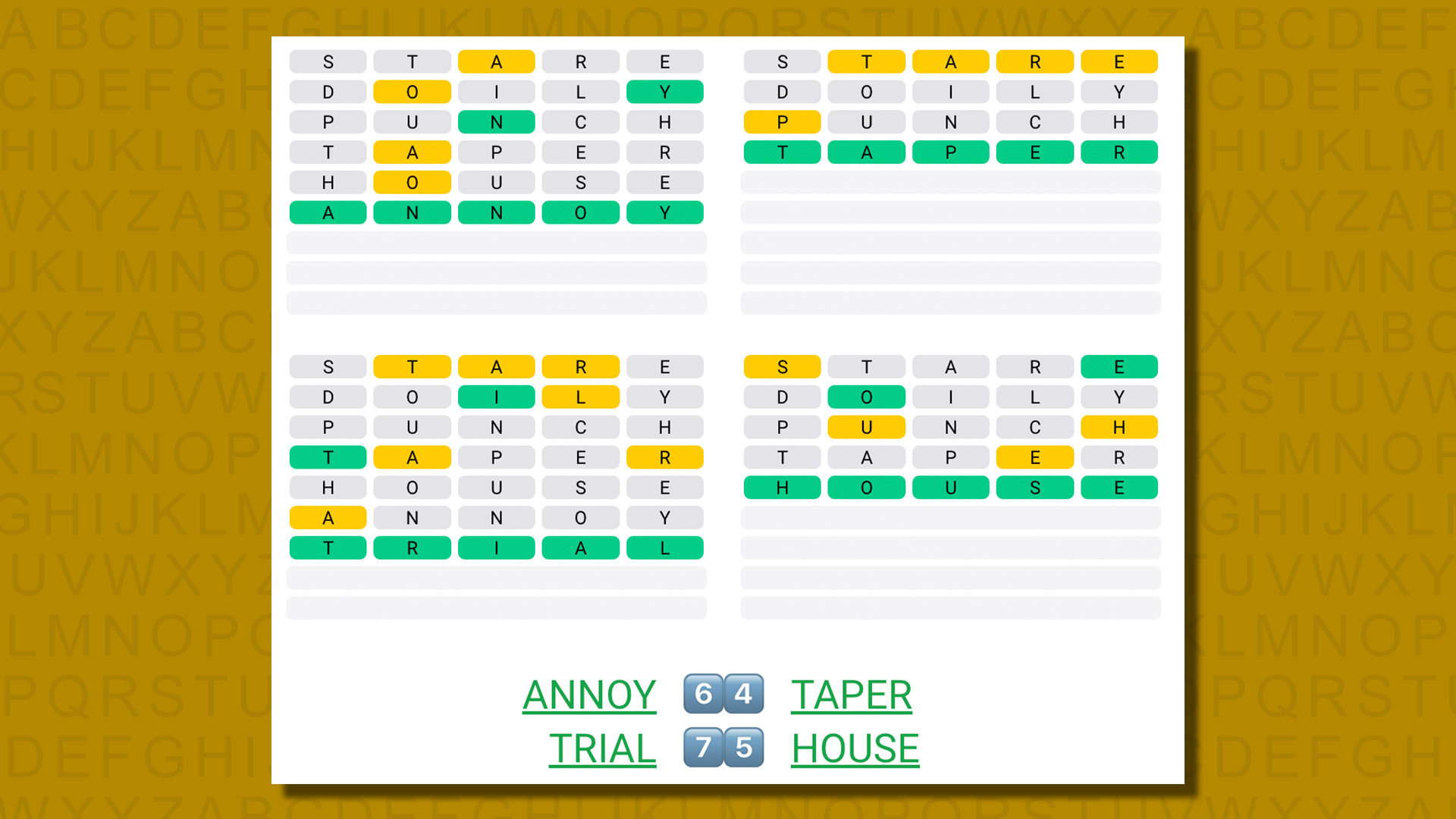 • The number of today’s Quordle answers starting with the same letter is 2.