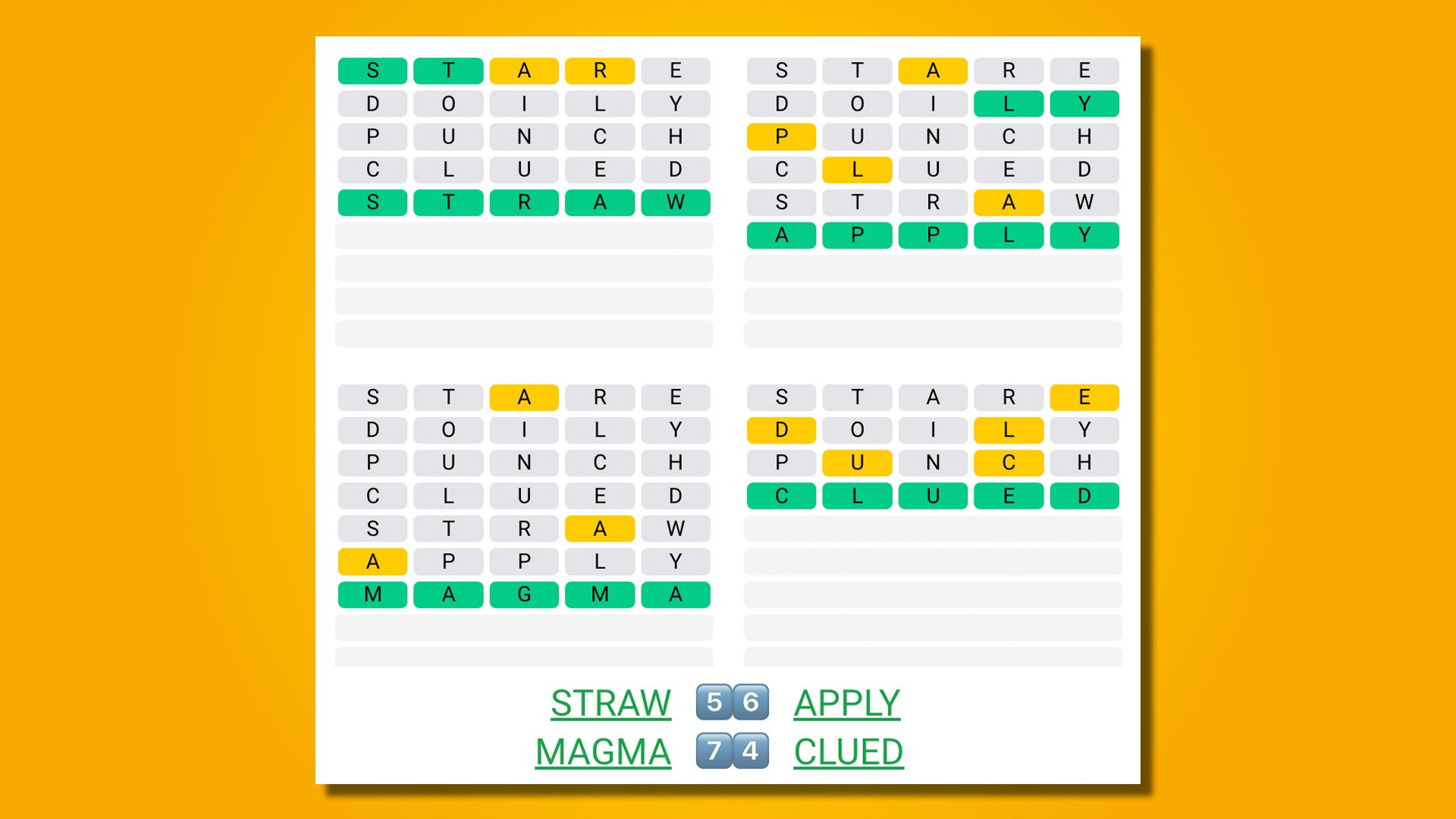 4. …BUT the word you guess appears in all quadrants of the puzzle at the same time, so an A could turn green in one square, yellow in another and gray in the final two.