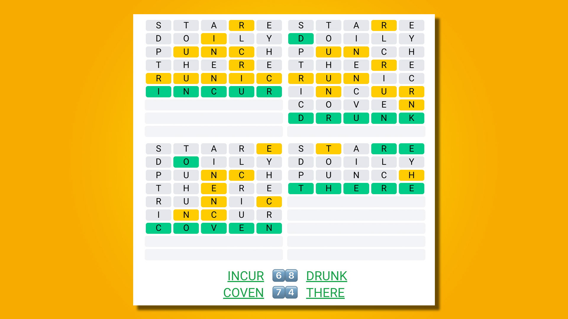 In Wordle, you can instead try several of those in succession and hope one is right, assuming you have enough guesses left. It’s risky, but will sometimes work. Plus, it’s the only option in Hard mode. But in Quordle, this will almost certainly result in a failure – you simply don’t have enough guesses.