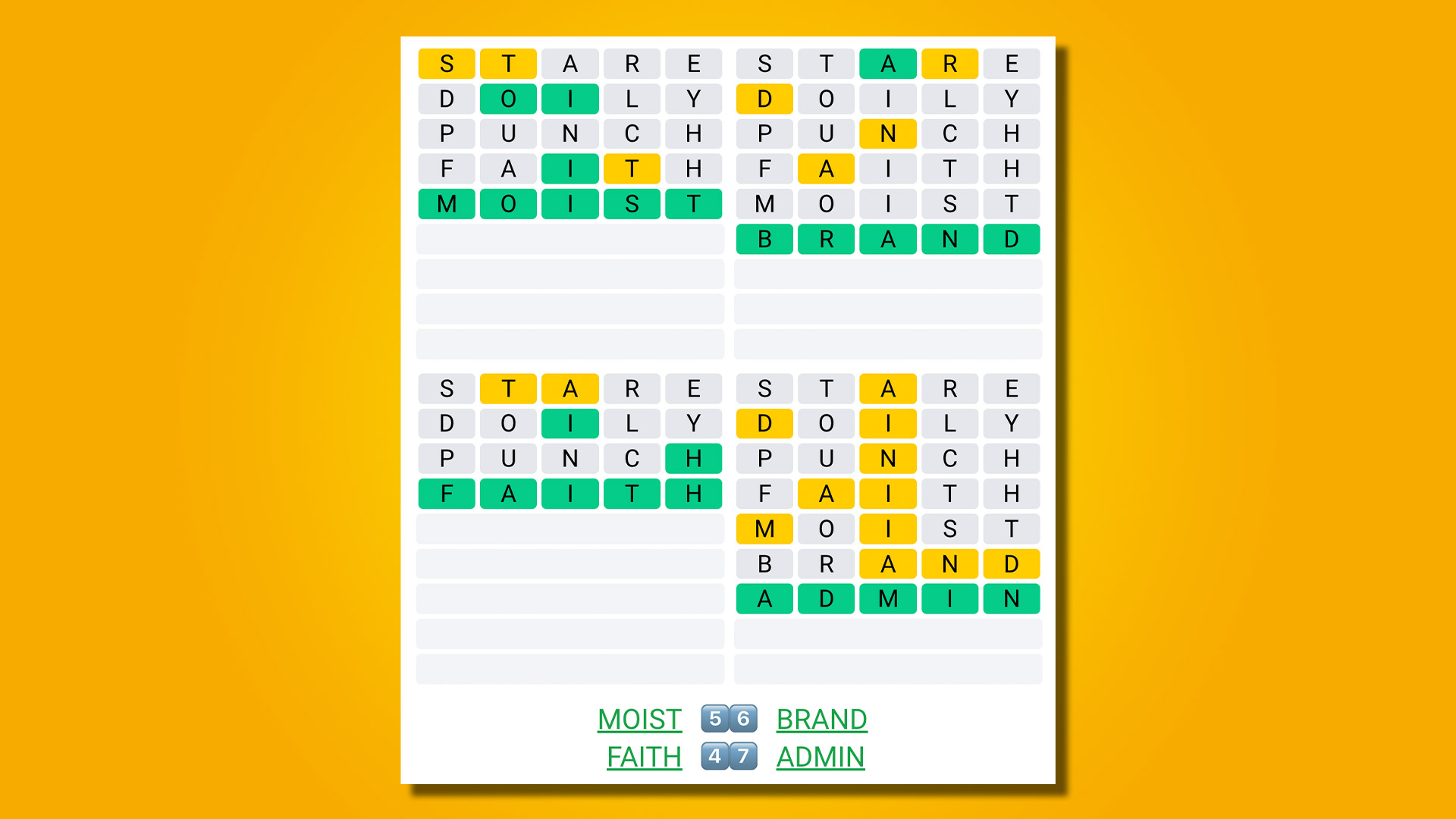 It was a similar story with MOIST, and though BRAND and ADMIN required a little more mental effort on my part, I was able to solve today's Quordle with two guesses remaining.
