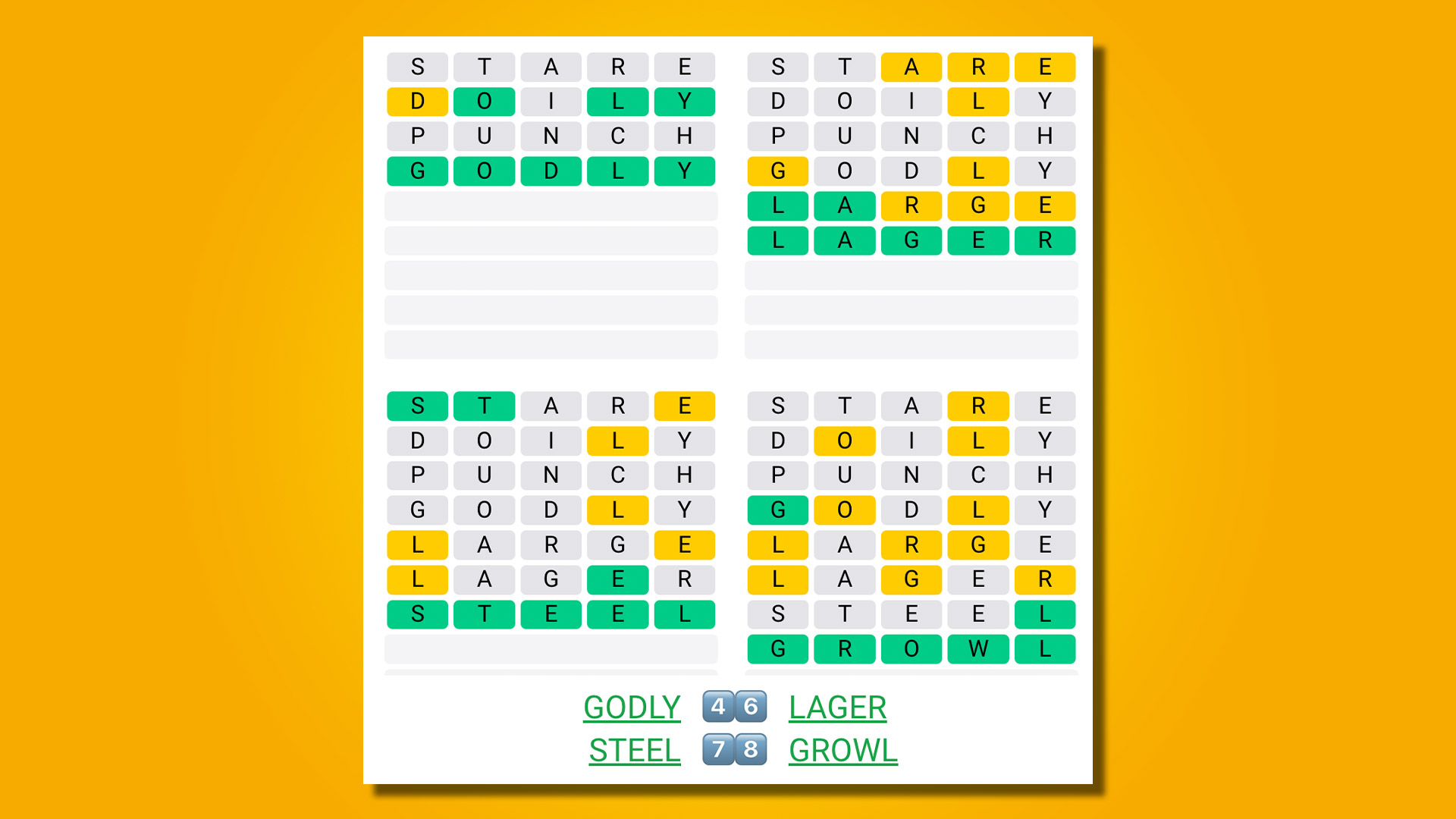 Once again I found today's Quordle to be a lot easier than today's Quordle Daily Sequence. Much of that was down to the words: GODLY, LAGER, STEEL and GROWL are all pretty common, whereas TULLE, the first Daily Sequence word, is a lot less so.