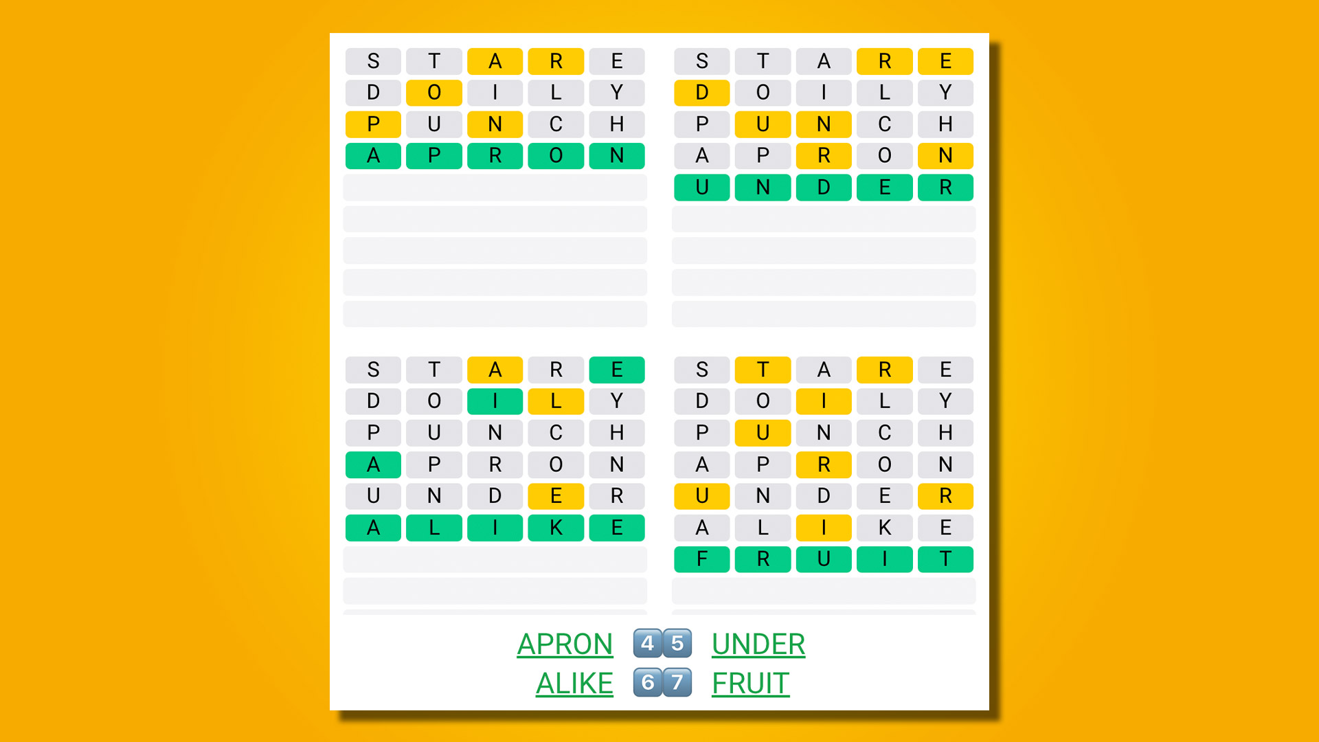 4. …BUT the word you guess appears in all quadrants of the puzzle at the same time, so an A could turn green in one square, yellow in another and gray in the final two.