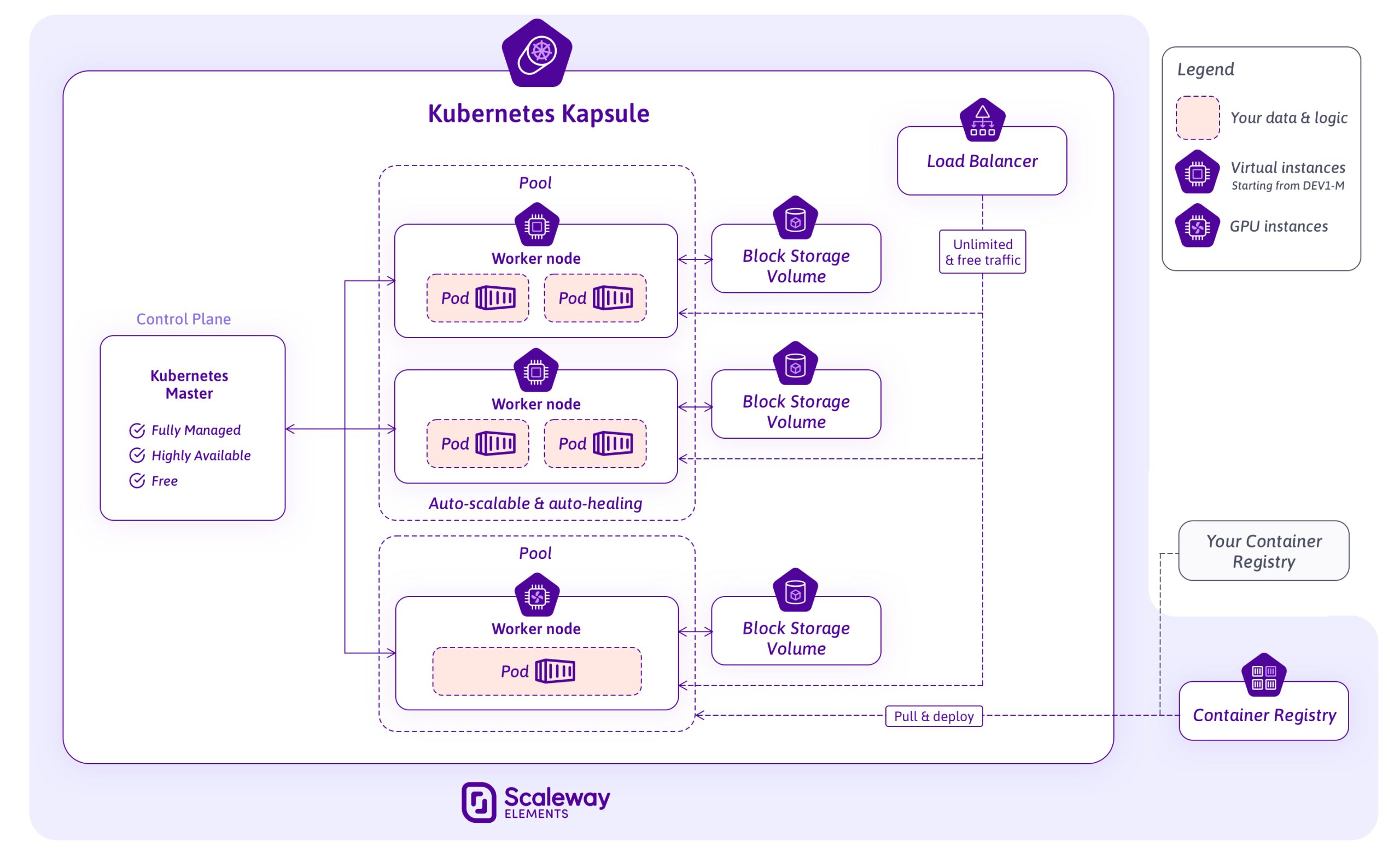 Kapsule supports Scaleway’s cloud instances, GPU-based instances, block storage and load balancers. The company also provides a container registry to store your container images. You could imagine building a cluster that looks like this: